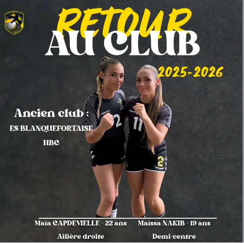 Après un passage à ES Blanquefort Handball , Maïa CAPDEVIELLE, 22 ans et Maïssa NAKIB sont de retour à Saint Médard Elles évoluent respectivement au poste d'ailière droite et de demi-centre.