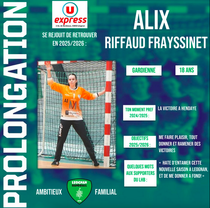 Alix Riffaud Frayssinet, jeune gardienne de 18 ans, reste le premier rempart du Léognan Handball. Le club cherche d'ailleurs une seconde gardienne pour enrichir l'effectif.