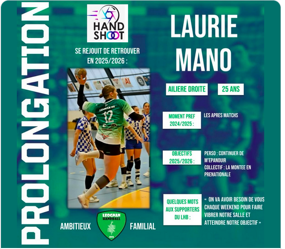 Laurie Mano, ailière droite de 25 ans, poursuit sa saison au Léognan Handball avec de beaux objectifs de réussite.