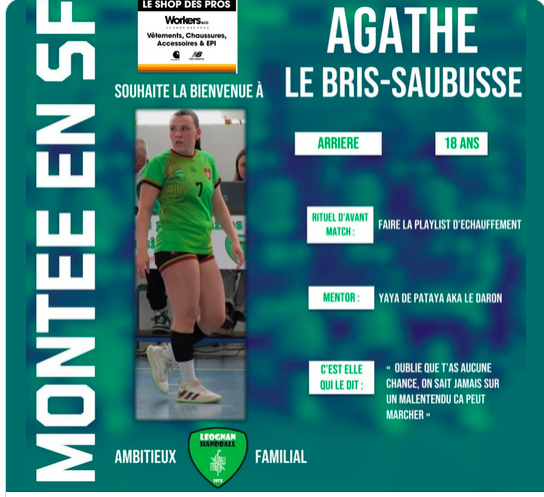 Agathe Le Bris-Saubusse, arrière de 18 ans, prend définitivement du galon. Elle rejoint le groupe séniors à l'orée de cette nouvelle saison. Groupe qu'elle connait déjà pour avoir réalisé quelques matchs la précédente saison.