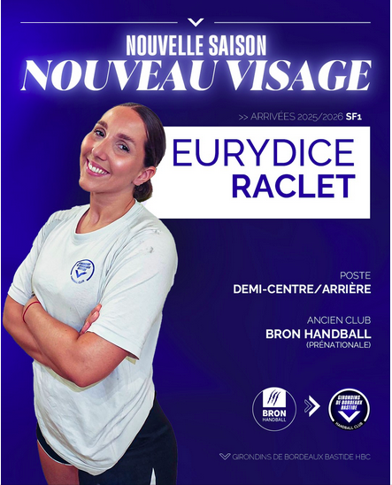 Evoluant au poste de demi-centre ou d'arrière, Eurydice Raclet qui jouait à Bron (Prénationale) vient d'intégrer les Girondines de Bordeaux Bastide HC promues en N3T.